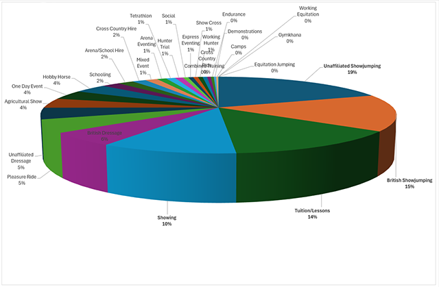 2. As usual we see the split of event types being driven by Showjumping and then Tuition with Showing moving up into 4th place. The previous year's Hobby Horse Craze is still continuing but appears to have settled at a steady percentage of events rather than going completely wild.