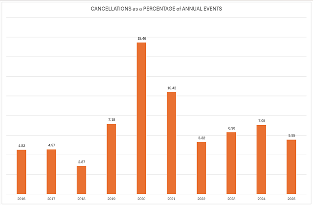 3. A new chart this year shows the percentages of cancelled shows. Last year was just over 5% - a low not seen for a few years - probably indicative of the relatively dry year. Nothing as crazy high as 2020 and 2021 when the Pandemic was causing events to be cancelled all over the place.