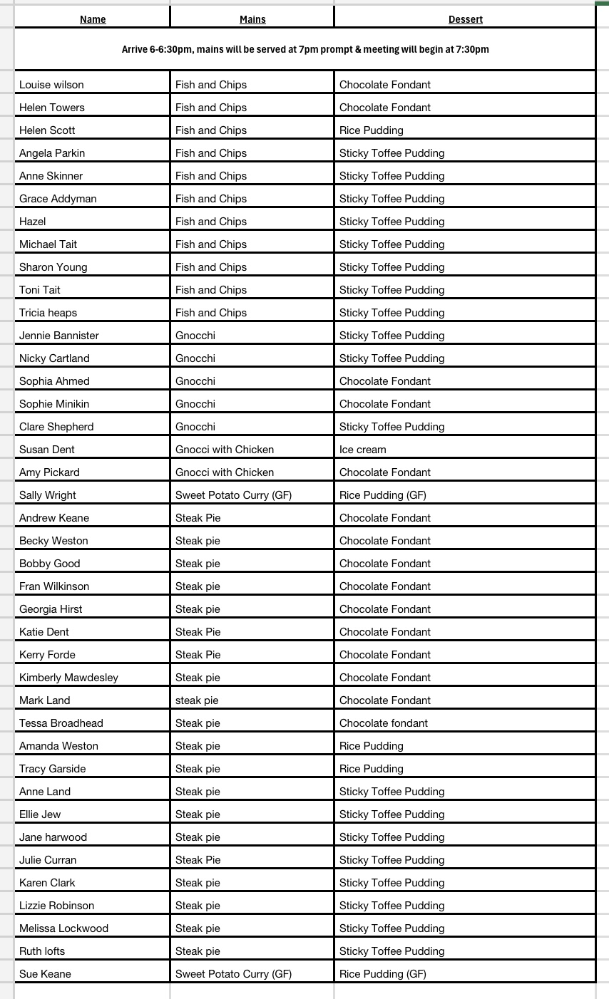 The evening will consist of arriving 18:30 onwards, main courses at 19:00, meeting to begin 19:30, desserts 20:30 followed by awards. evening to end approx 22:00. Open to all HCTG members.