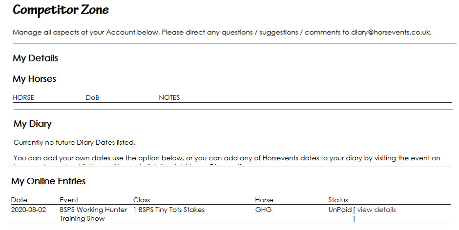 Once registered you will be able to login at:horsevents.co.uk/cp/
