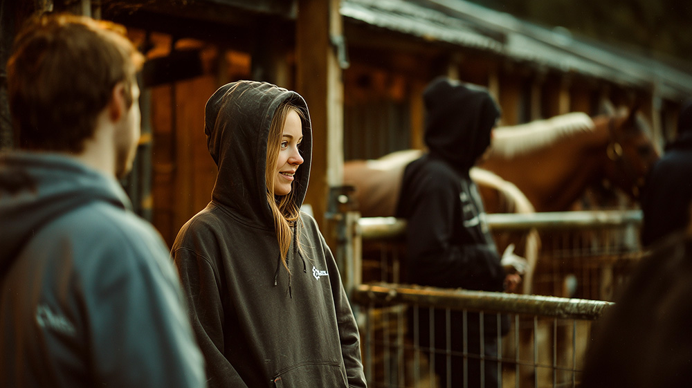 Alongside this sits a second, equally important category of clothing worn by yard staff, grooms, coaches, helpers, and event crews. These garments function as uniforms. Staff wear them as part of a role rather than a choice. Durability, clarity, and consistency matter more than expression. Branding in this context supports recognition and authority rather than personal affiliation.