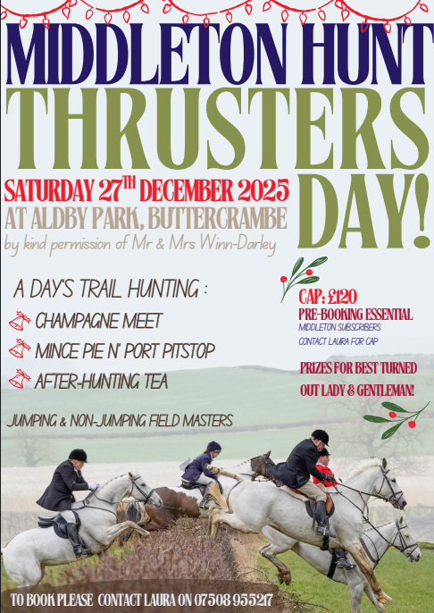The day will begin with a champagne meet at Aldby Park before following hounds over some of our best country jumping a variety of obstacles. There will be a non jumping field master and there is a way around everything! At halfway we will stop for a mince pie and port pit stop before continuing on and eventually finishing at Aldby park for a traditional hunting tea. An opportunity to cross country that you wouldn't otherwise get the chance to enjoy.